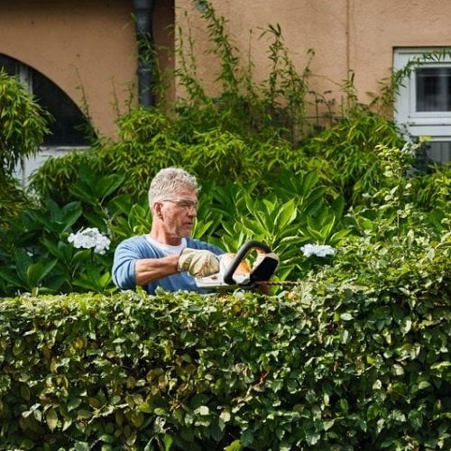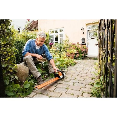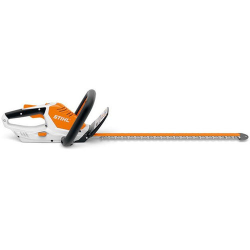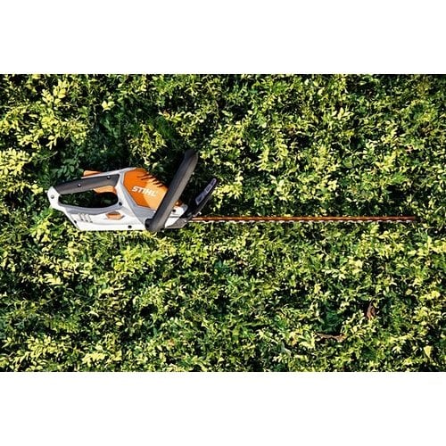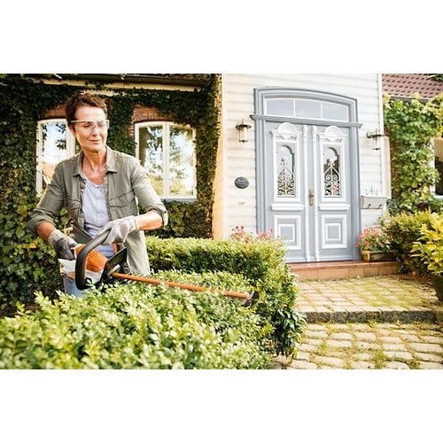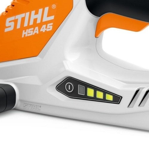 The ultra-light STIHL HSA 45 battery-powered hedge trimmer provides excellent cutting power for maintaining hedges and branches around the house. The single-sided ground, double-action blades have a tooth spacing of 24 mm, ensuring a clean cut. With a 32° cutting angle, this trimmer delivers high and professional cutting power. The integrated blade guard adds safety and comfort. The screwed-on blade protector protects the blade tip from damage when working near a wall or close to the ground. The HSA 45's integrated battery has a capacity of 36 Wh with a charge level indicator. Weighing only 2.3 kg, with a charging time of 145 minutes (80%) / 210 minutes (100%), this is an ideal hedge trimmer for small or medium-sized gardens.