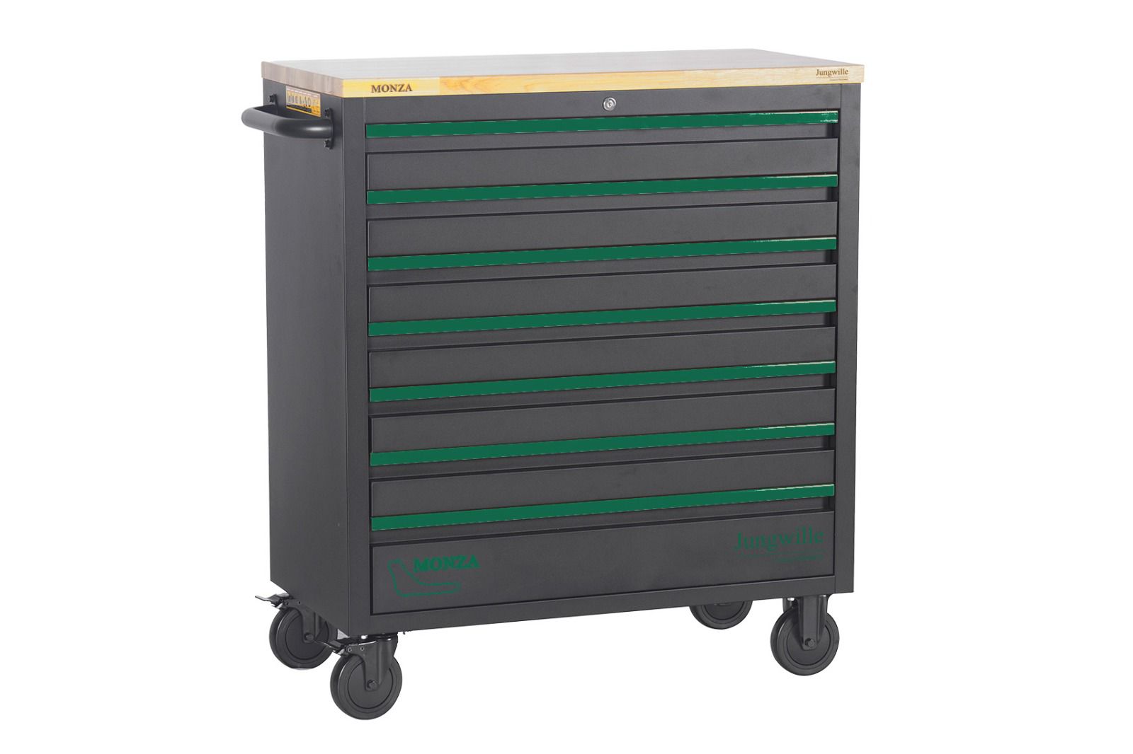 De laden zijn uitgerust met stevige stalen grepen en lopen soepel op geleiders, met een 100% uittrekfunctie voor maximale toegankelijkheid. De wagen staat stabiel op vier hoogwaardige 5-inch wielen, waarvan twee zijn voorzien van een rem en twee vast zijn gemonteerd – voor veilige verplaatsing en positionering. Met de bijgeleverde sleutels kunnen de laden centraal worden vergrendeld voor extra veiligheid.